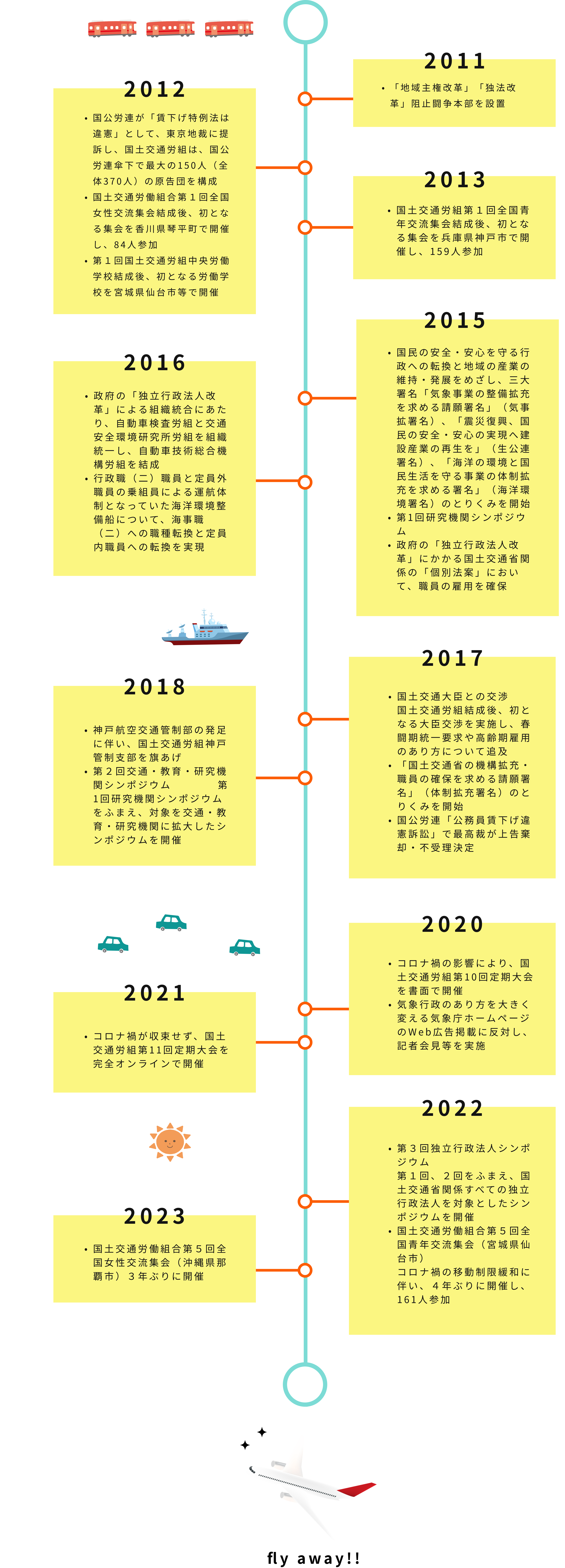 国土交通労働組合は2011年9月11日、全運輸労働組合、国土交通省全建設労働組合、全気象労働組合、全運輸省港湾建設労働組合および海員学校職員組合、海技大学校職員組合の6つの労組が大同団結し、結成しました。
