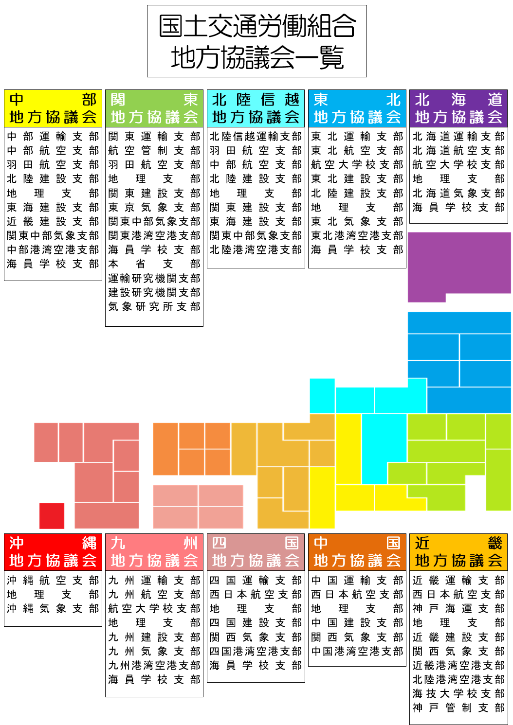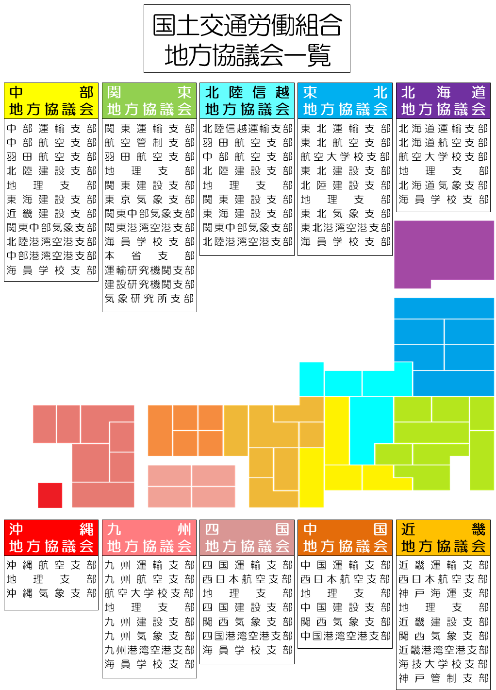 国土交通労働組合は、10の地方協議会(北海道・東北・北陸信越・関東・中部・近畿・中国・四国・九州・沖縄)を組織しています。それぞれの地域において、公務や民間のなかまと一緒に、学習交流集会やレクリエーションなどを行っています。