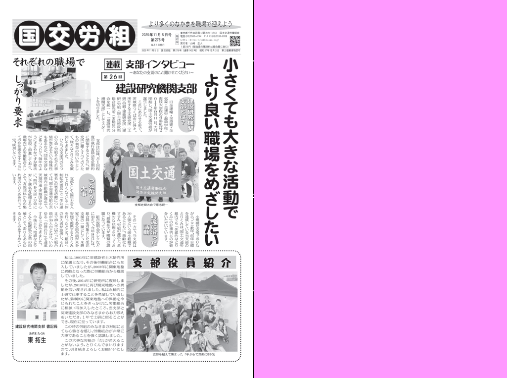 2025年11月5日 276号・1面 支部役紹介記事、支部役員紹介・2、5面 秋闘のとりくみ、人事院勧告の取り扱いについて、10月活動報告・3、4面 船舶行政全国委員会、昇格上京団行動(運輸、航空 […]